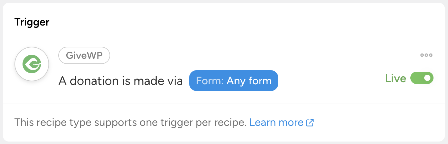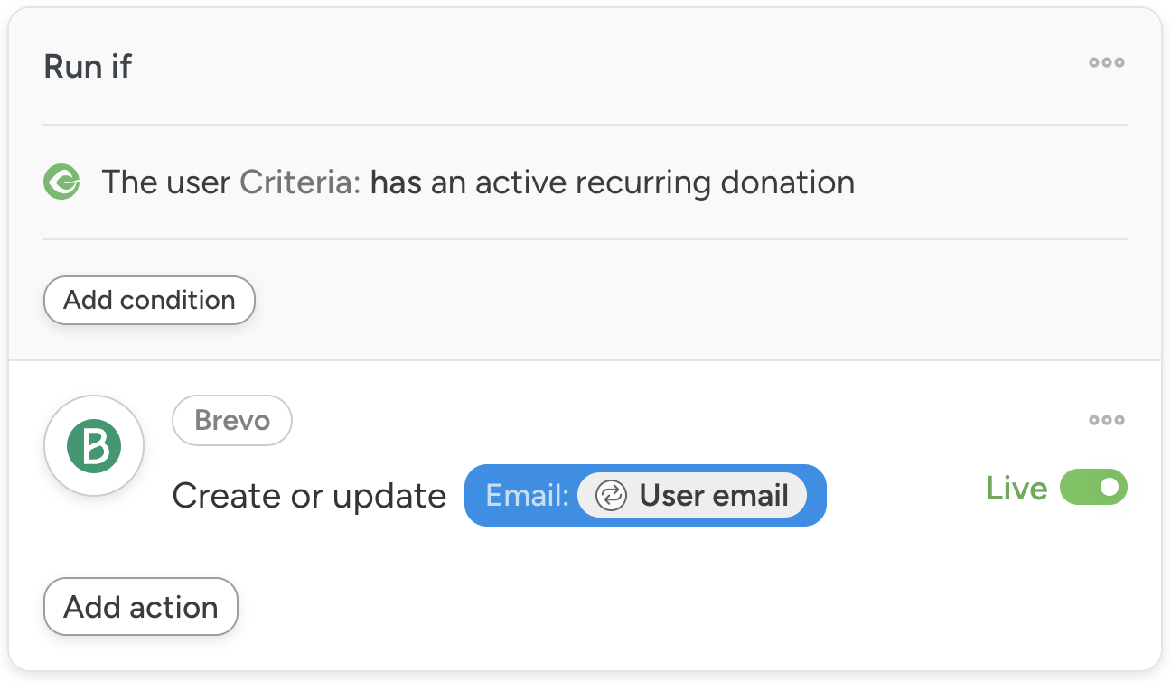 One of the first tasks you’ll want to automate when connecting GiveWP to Brevo is syncing your donors to your CRM in real-time. In this section, we’ll walk you through the simple steps to recreate the recipe pictured below.