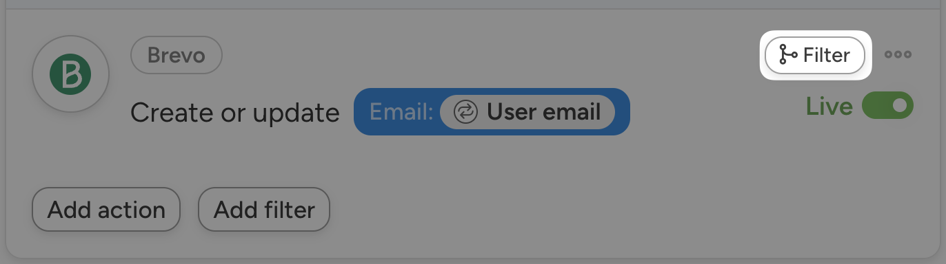 As the recipe stands now, Automator will export every user that isn’t a site administrator to your Brevo contact list. However, we may want to be a bit more targeted than that. For this, we have action filters.To add a filter, hover the action and click Filter.