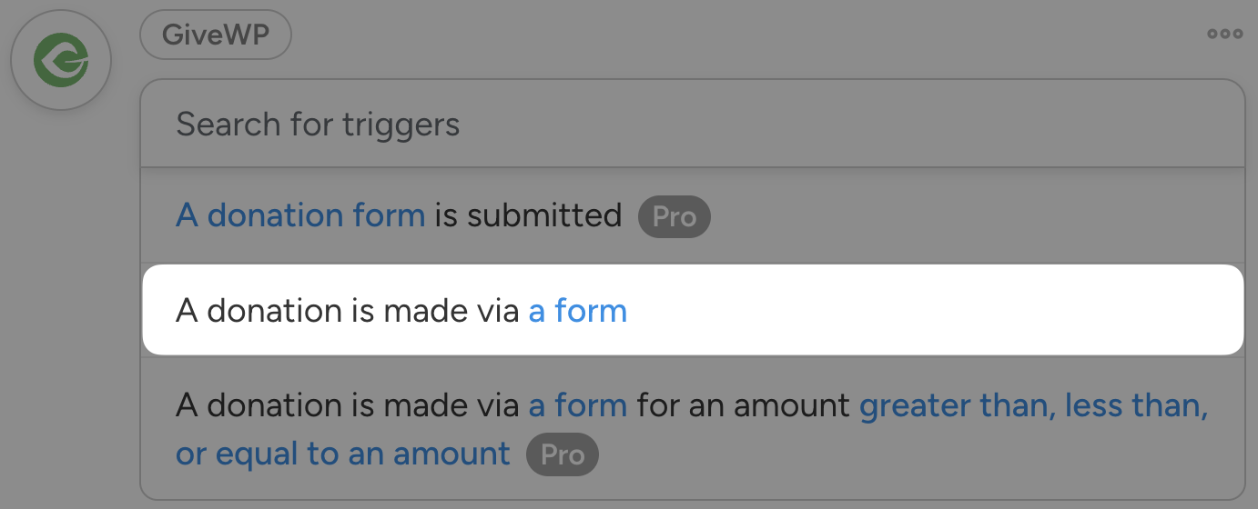 In the Trigger panel, from the menu of available integrations, select GiveWP.