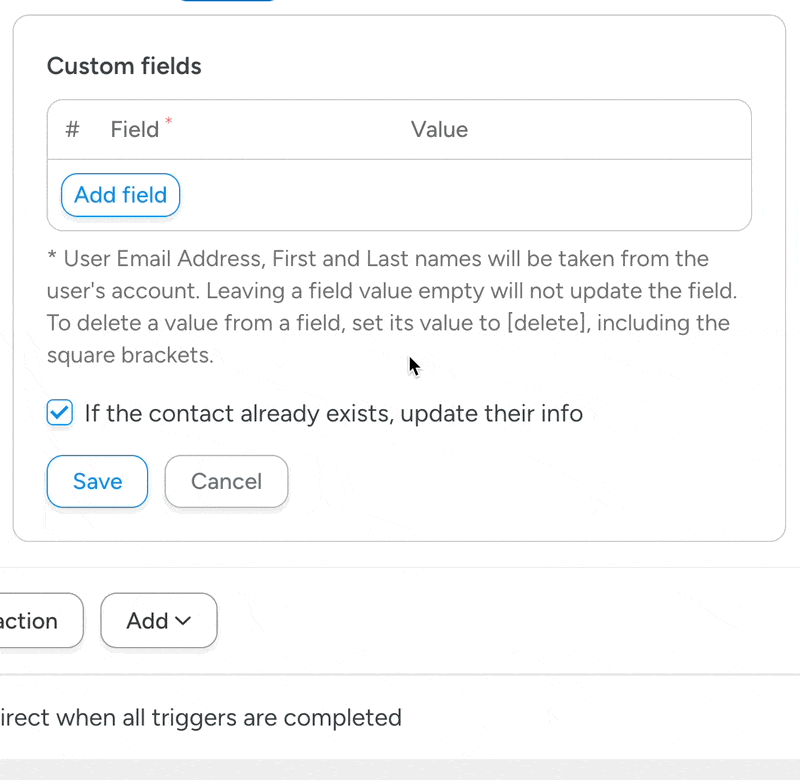 Add as many fields as you want to update. Once you’re finished, click Save. Your completed action should look like this: