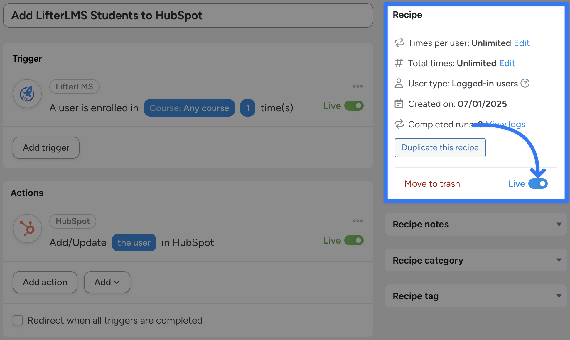 You’re just about ready to connect LifterLMS to HubSpot and perfectly sync your student records with your CRM. All that’s left for you to do is to toggle the recipe from Draft to Live.