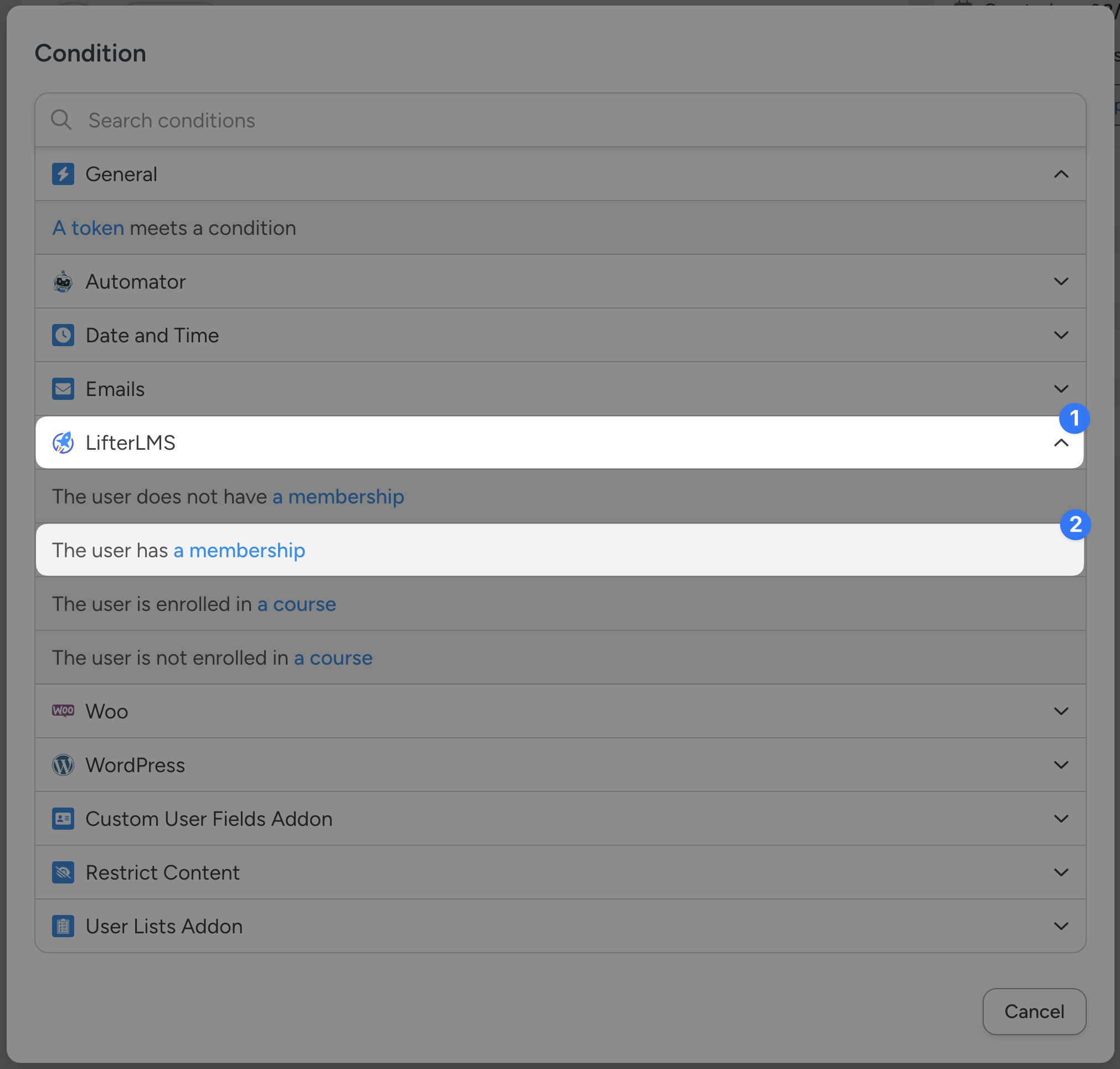 In the modal that appears, click LifterLMS and select the filter condition that you want to have applied to the action. For example, we have selected the filter condition “The user has a membership”.