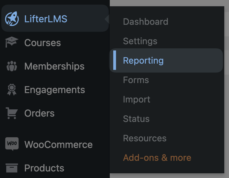 LifterLMS allows you to download CSV files of reports. To do this, navigate to LifterLMS > Reporting from your WordPress Admin Dashboard.