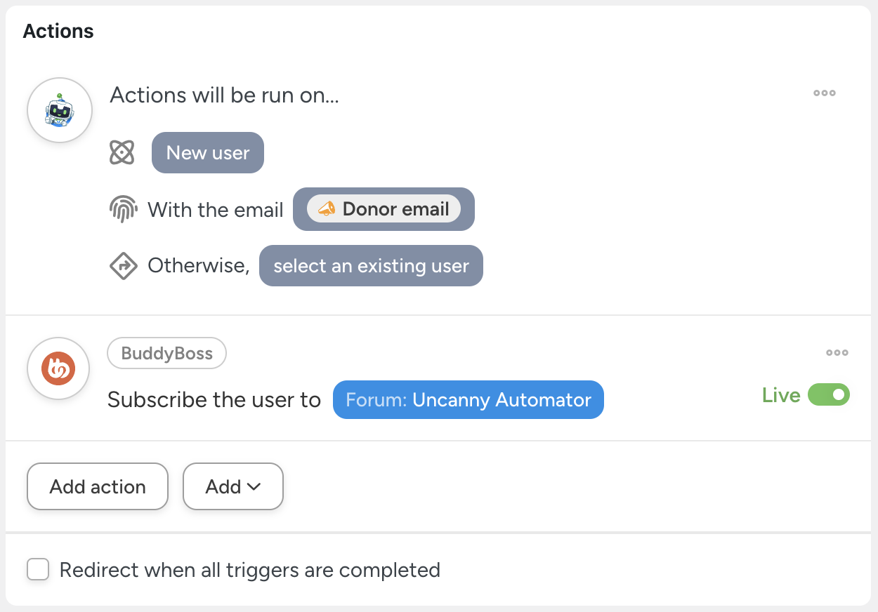 Whether it’s welcoming new donors to exclusive groups, engaging recurring contributors in forums, or celebrating your biggest supporters in activity streams, Uncanny Automator makes it all possible—and effortless.