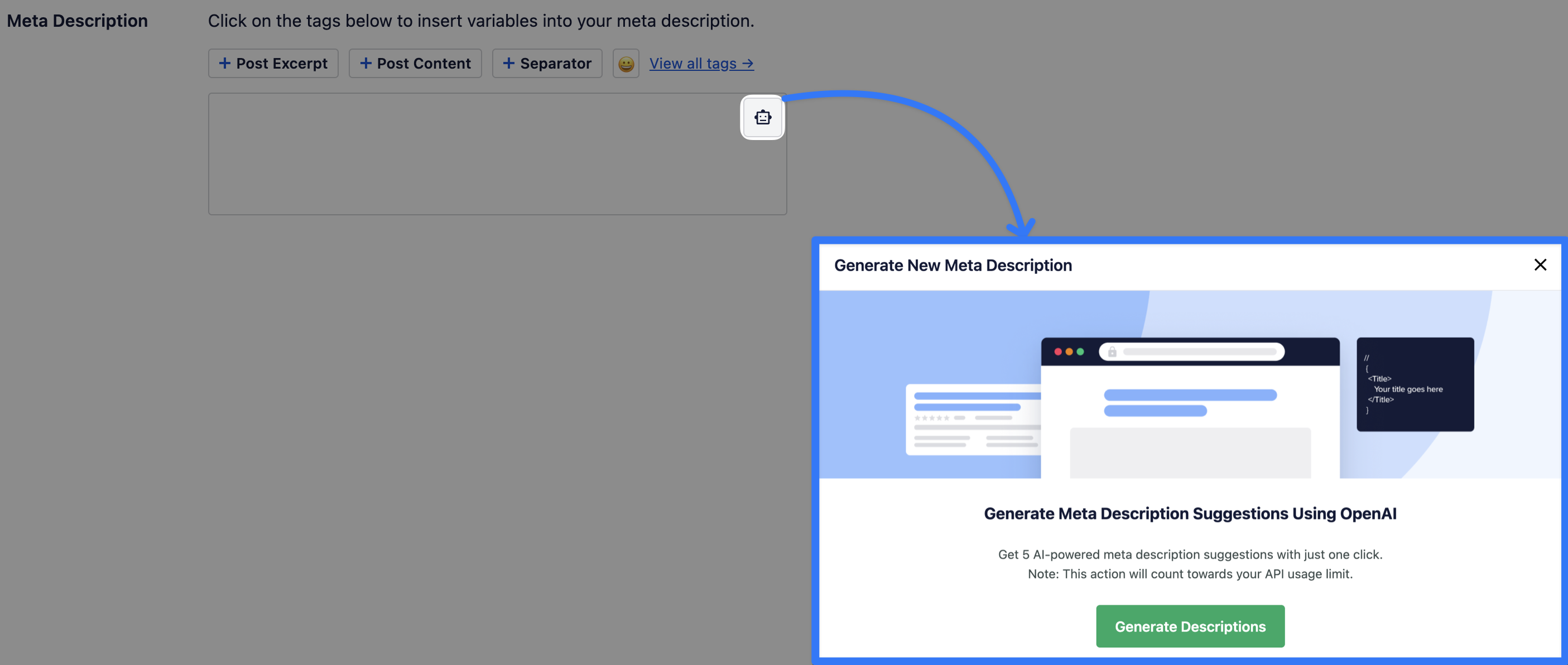 Integrating WordPress automations with AI opens up a whole new set of possibilities for bloggers. For example, you can use AIOSEO’s AI feature to generate titles and meta descriptions that are guaranteed to help boost your SERPs.