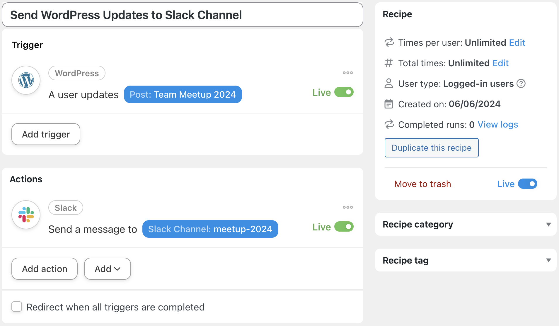In the recipe pictured above, for example, we’re able to update the relevant Slack channel(s) whenever a WordPress post is updated. With a recipe like this one, you can keep your teams collaborating on everything from events and products to courses and pages.