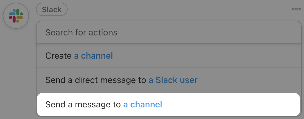 In the Actions panel, click Add action and select the Slack integration. From the dropdown list that appears, select Send a message to a channel.