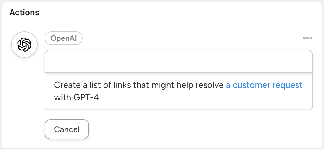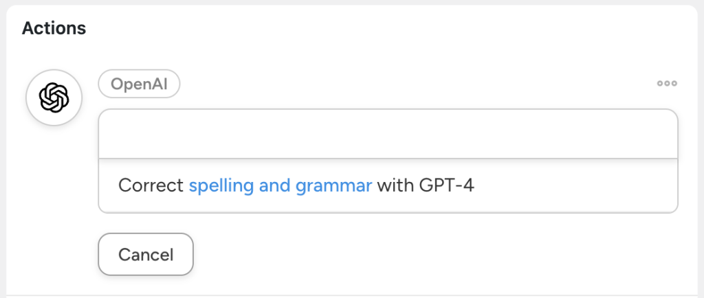 In the Actions panel, click Add action and select OpenAI. From the dropdown list that appears, select Generate an excerpt with GPT-4.
