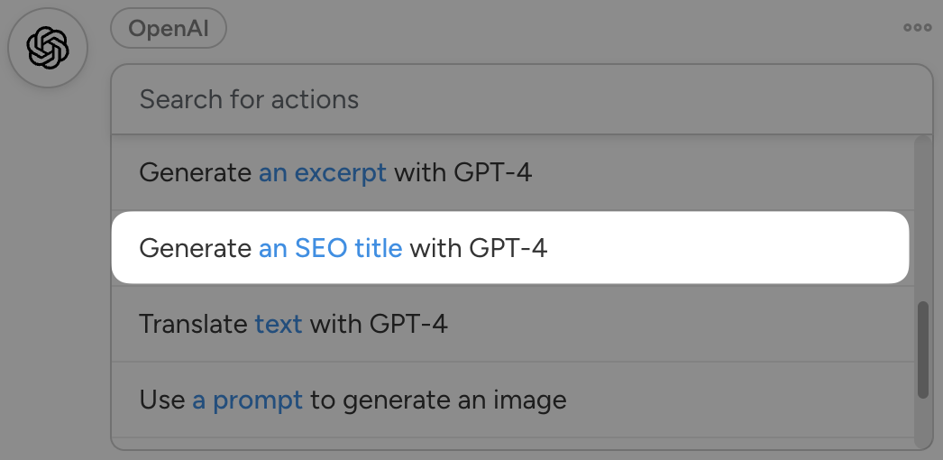 In the Actions panel, click Add action and select OpenAI. From the dropdown list that appears, select Generate an SEO title with GPT-4.