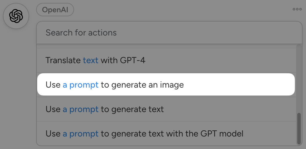 In the Actions panel, click Add action and select OpenAI. From the dropdown list that appears, select either “Use a prompt to generate an image” or “Use a prompt to generate an image with DALL-E“.