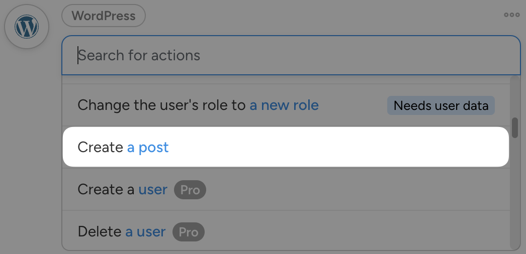 Dropdown list of WordPress actions in Uncanny Automator. The user has highlighted the action "Create a post".