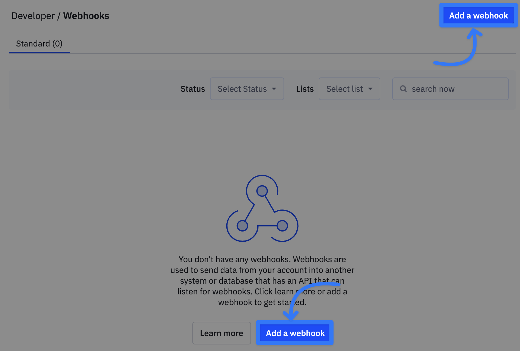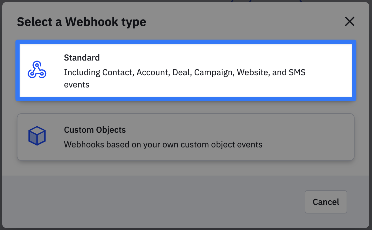 6. Select the webhook type. In most cases, a Standard webhook is sufficient.