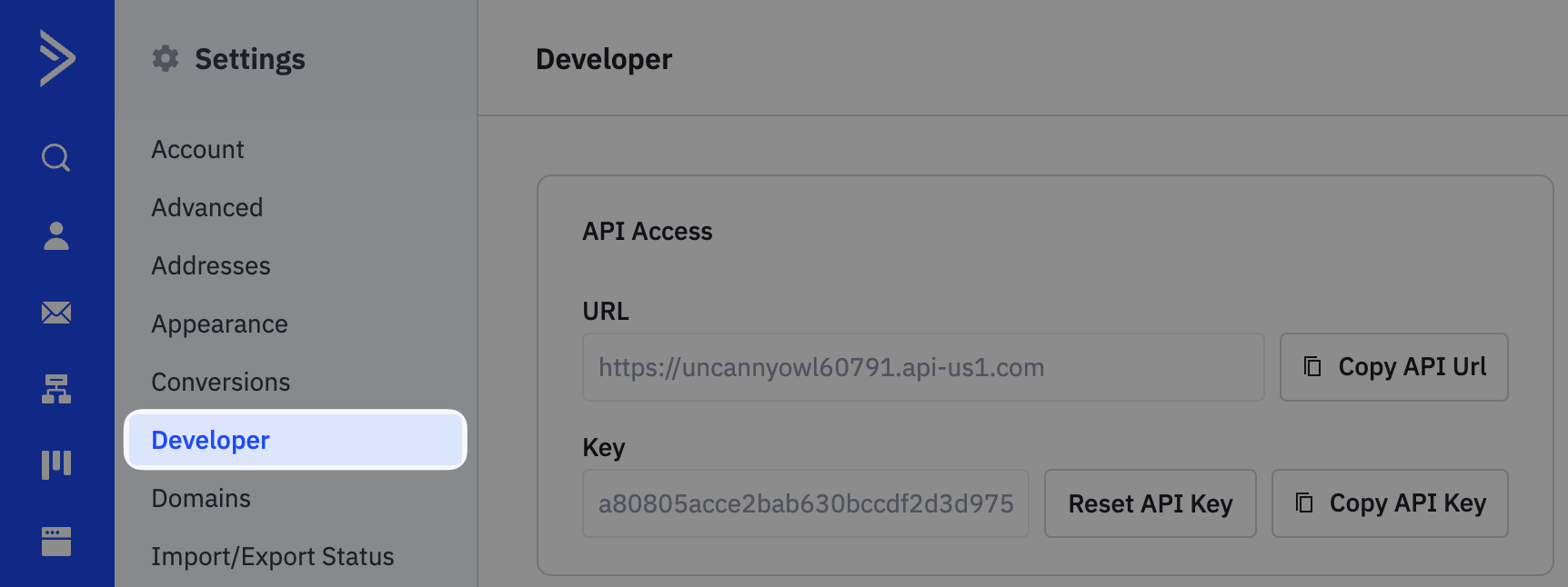 3. Log in to your ActiveCampaign account and navigate to Settings > Developer.