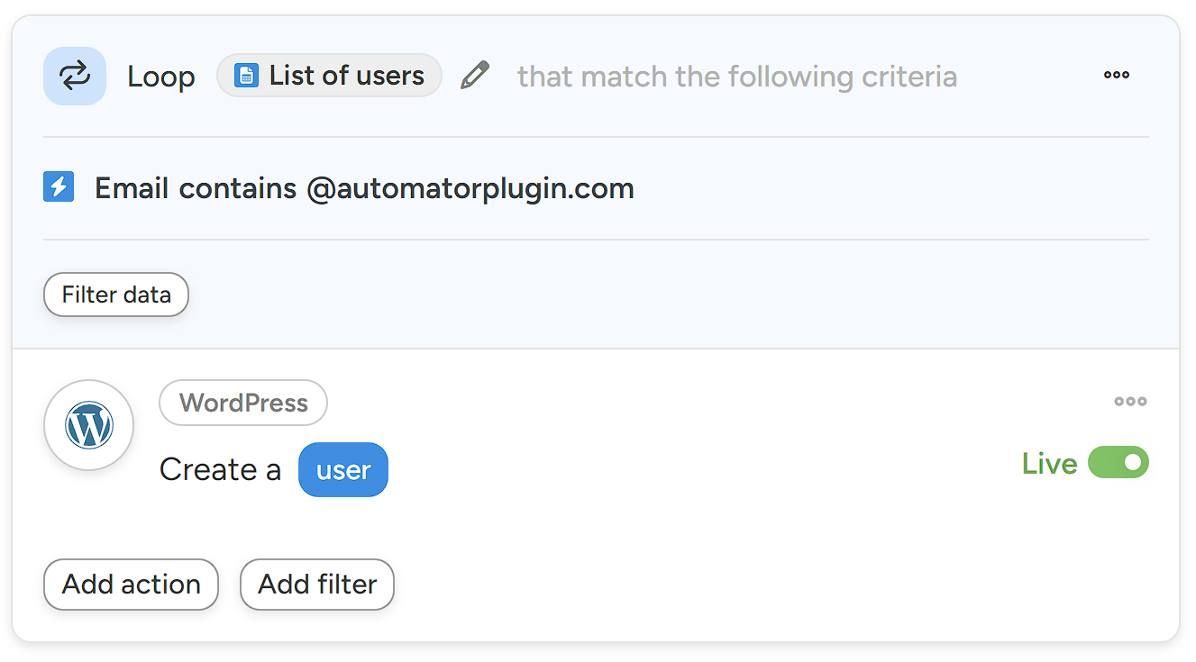 4. Add an action to the Token loop. This action will run on each row in the CSV data that matches the filter criteria. In this example, we’ve set the loop to create a new user for every row in the CSV where the Email column contains a specific domain (In this case automatorplugin.com):