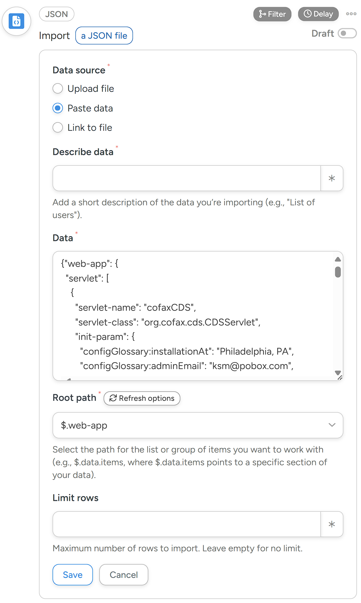 - In the trigger/action, choose whether you want to paste in JSON data, link to an external JSON file, or upload a JSON file from your computer.