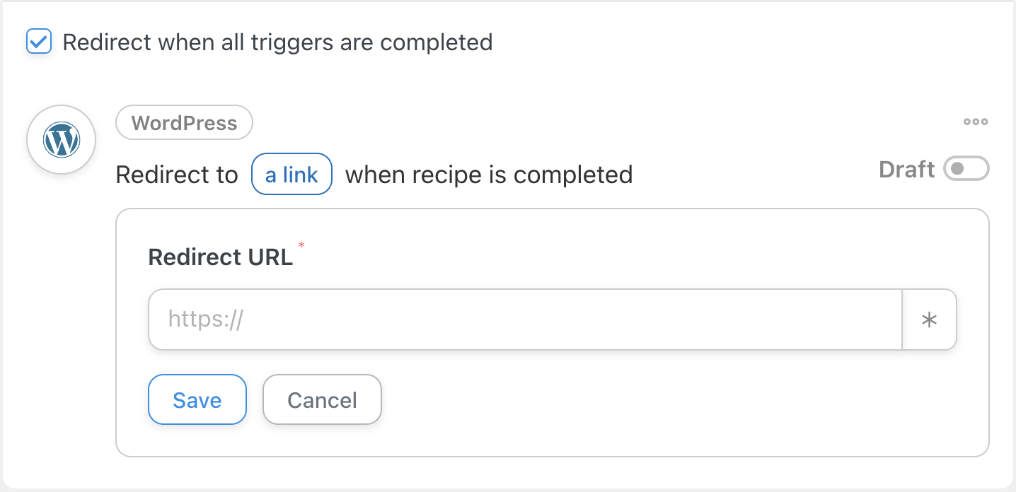 Clicking the button will reload the page the user is on. That could be a confusing user experience, as there won’t be any visual confirmation that the button was clicked or the actions have been completed. So in the recipe containing the button, we recommend checking Redirect when all triggers are completed to take the user to a page that describes what actions have been completed and suggests next steps.
