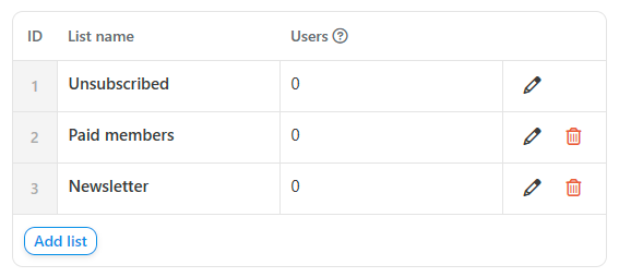 To delete a list, click the delete icon next to the list. Deleting a list will also permanently remove all users from that list. It’s not possible to restore a deleted list, so be sure you no longer need a list before deleting it.