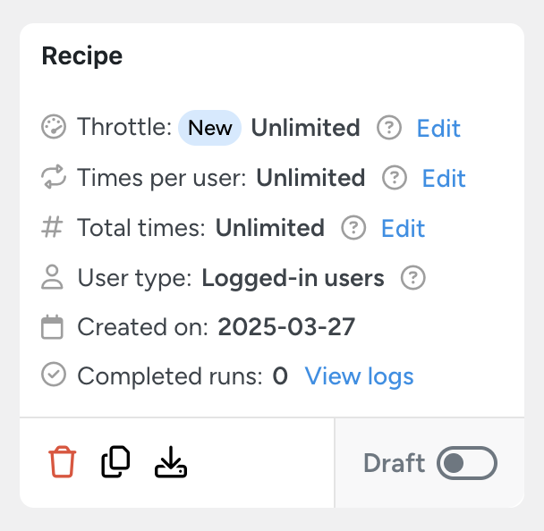 You can also view the recipe’s logs, duplicate or export the recipe from this panel.