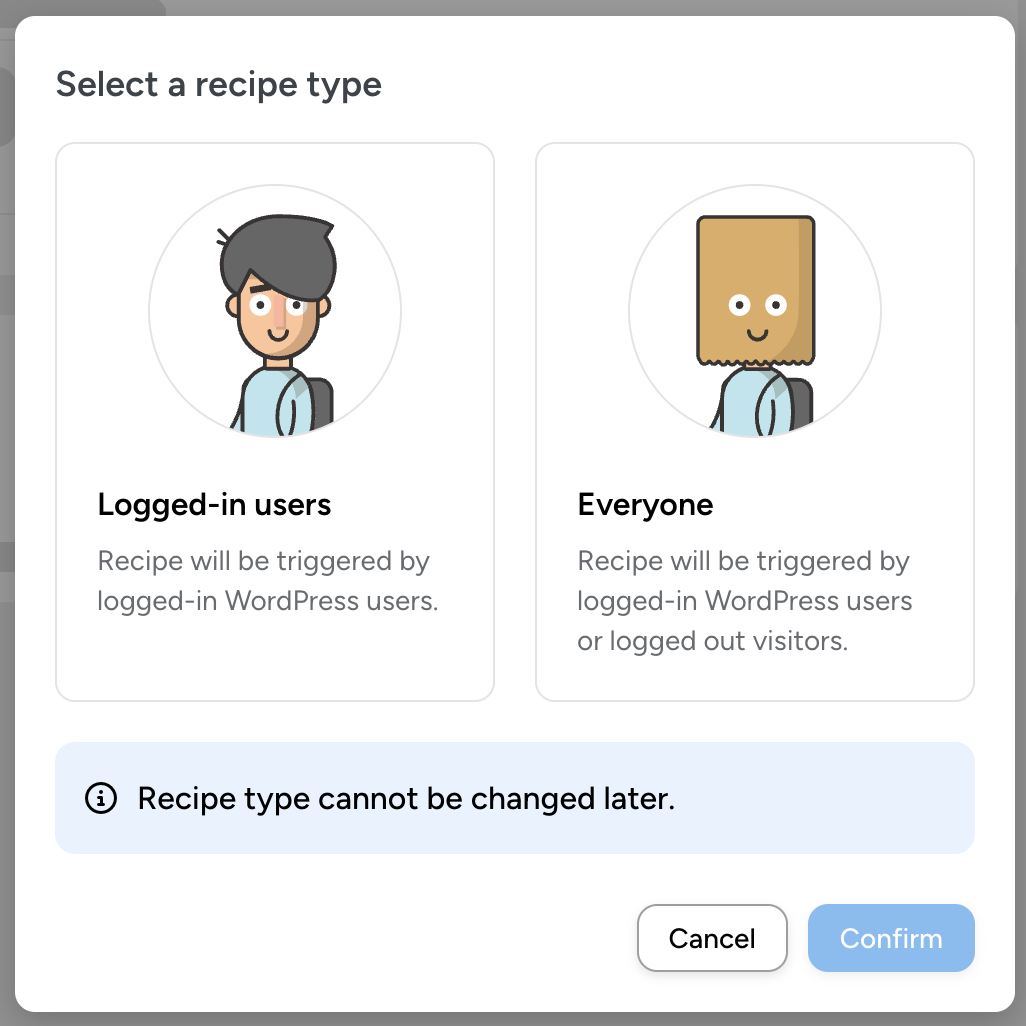 When building a recipe in Uncanny Automator, you’ll first need to choose the recipe type. whether the recipe is triggered by logged in users or everyone: