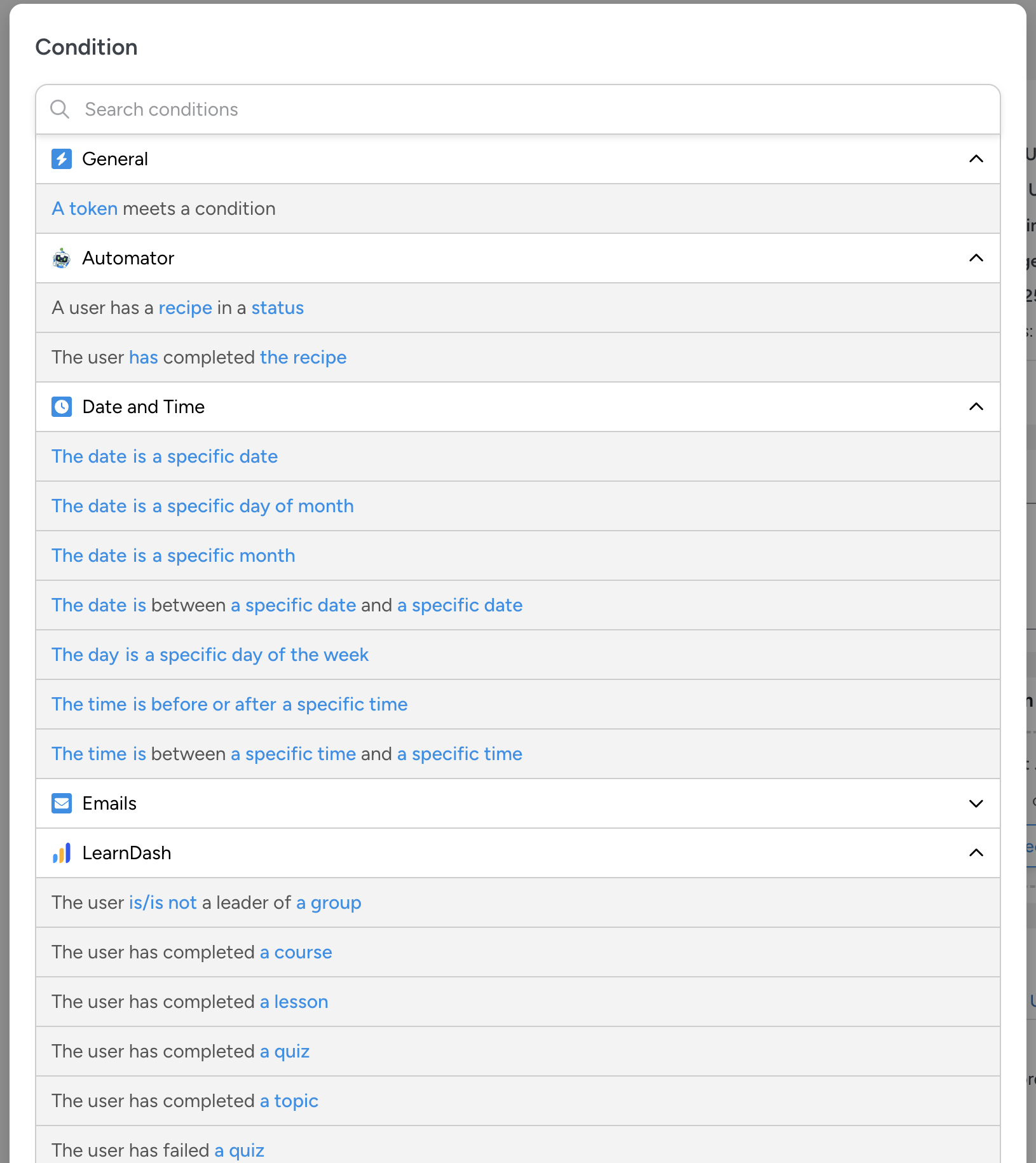 Some conditions are integration-specific (in the screenshot above, LearnDash conditions are available because the LearnDash plugin is installed).