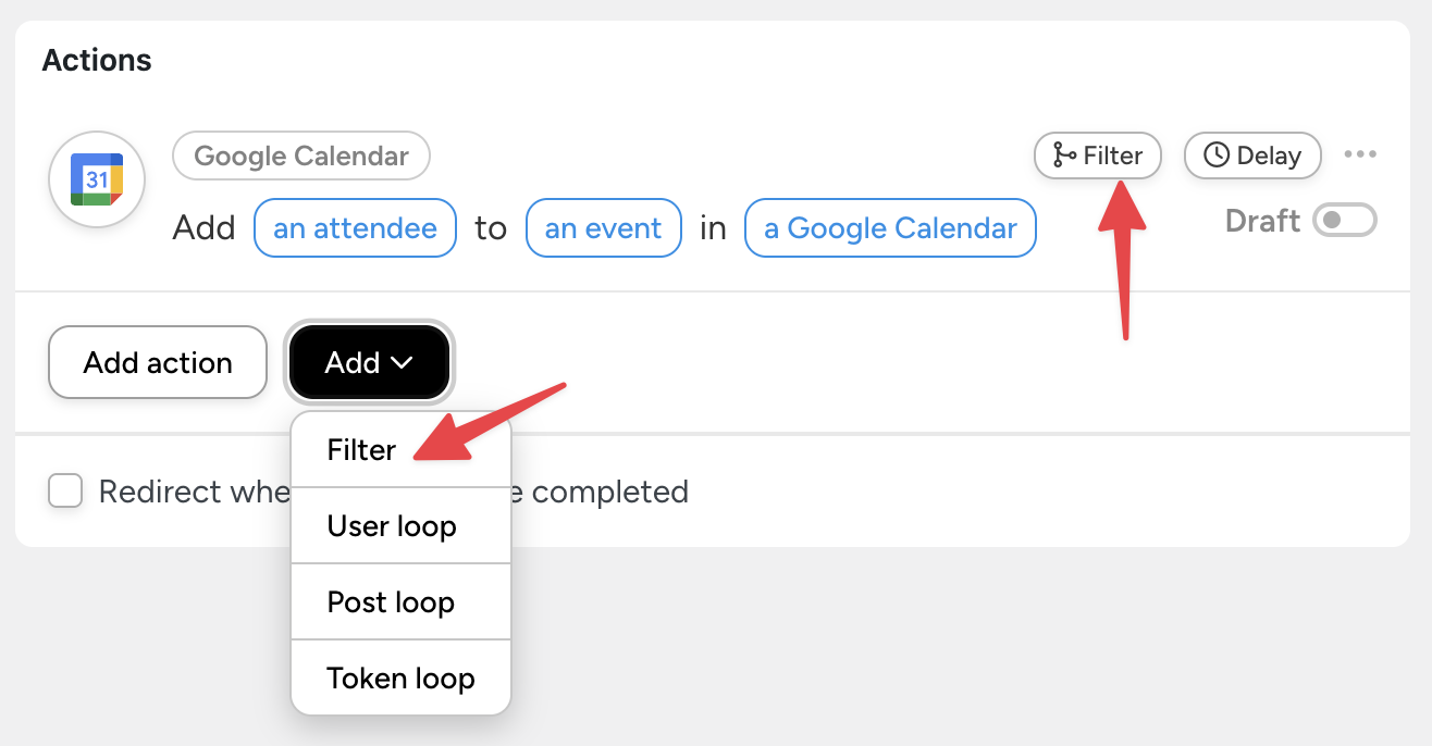 In Uncanny Automator, filters are added to recipes directly or in the context of a particular action: