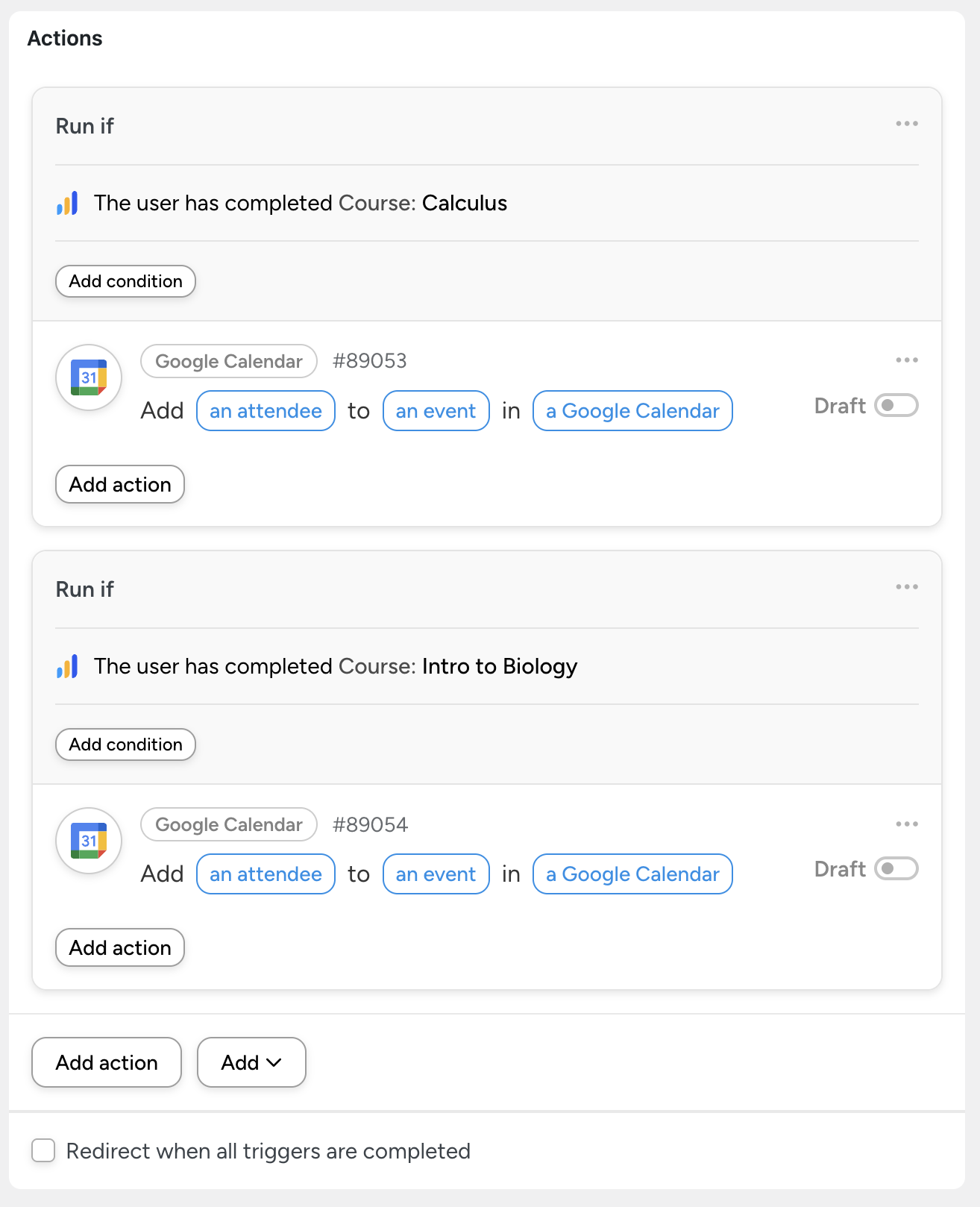 - Google Calendar integration: Use Google Calendar to manage events. Create events and manage attendees based on form submissions, lesson completions, purchases and more.