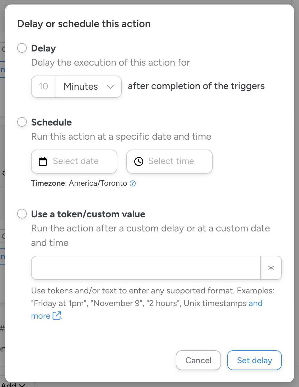You can also dynamically set the delay or schedule based on tokens from the trigger, such as an incoming webhook or a field value in a form submission.