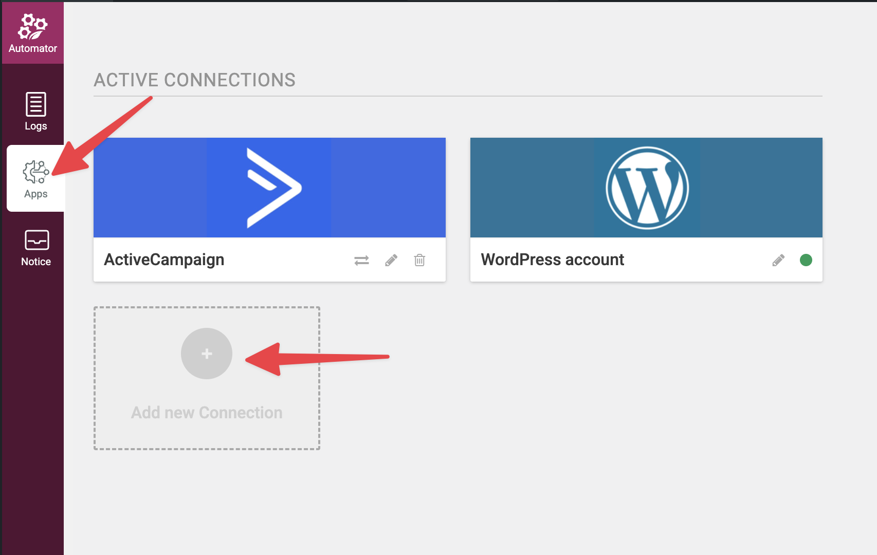 In Thrive Automator, you connect apps from Thrive Dashboard > Thrive Automator > Apps > Add New Connection: