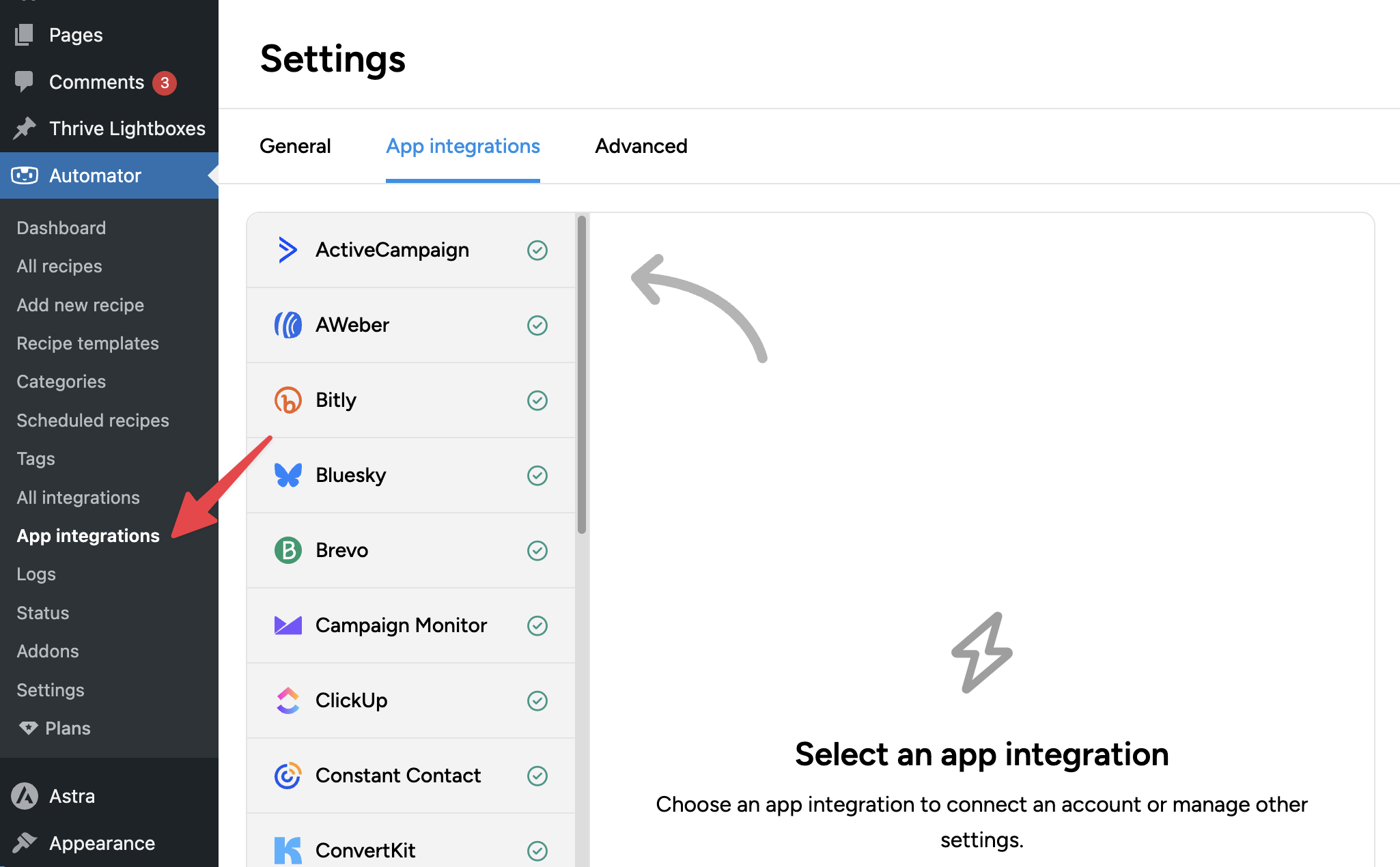 In Uncanny Automator, you connect Apps from Uncanny Automator > App Integrations: