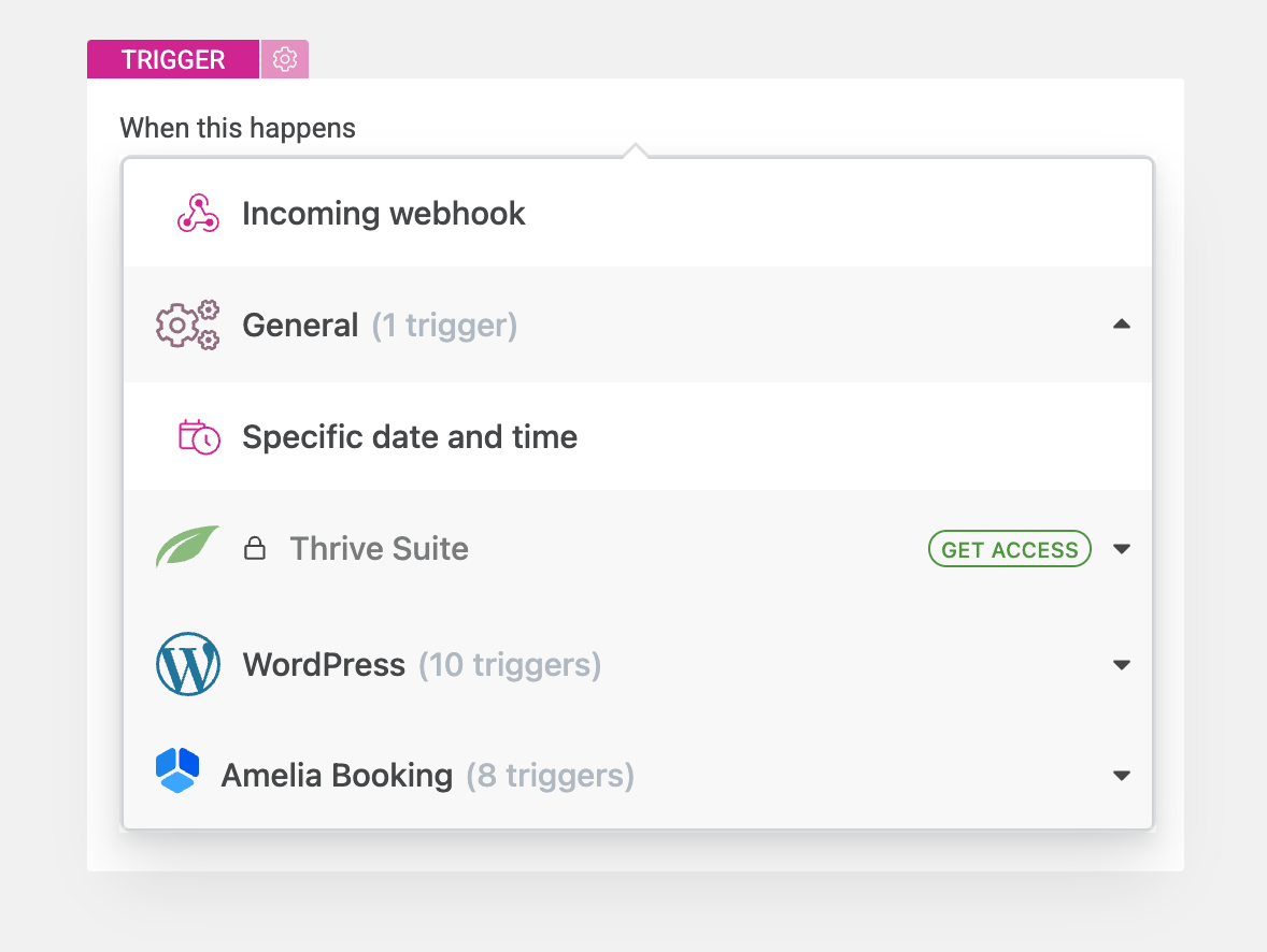 - After choosing a trigger in Thrive Automator, you may additionally limit when the trigger will fire with specific criteria.