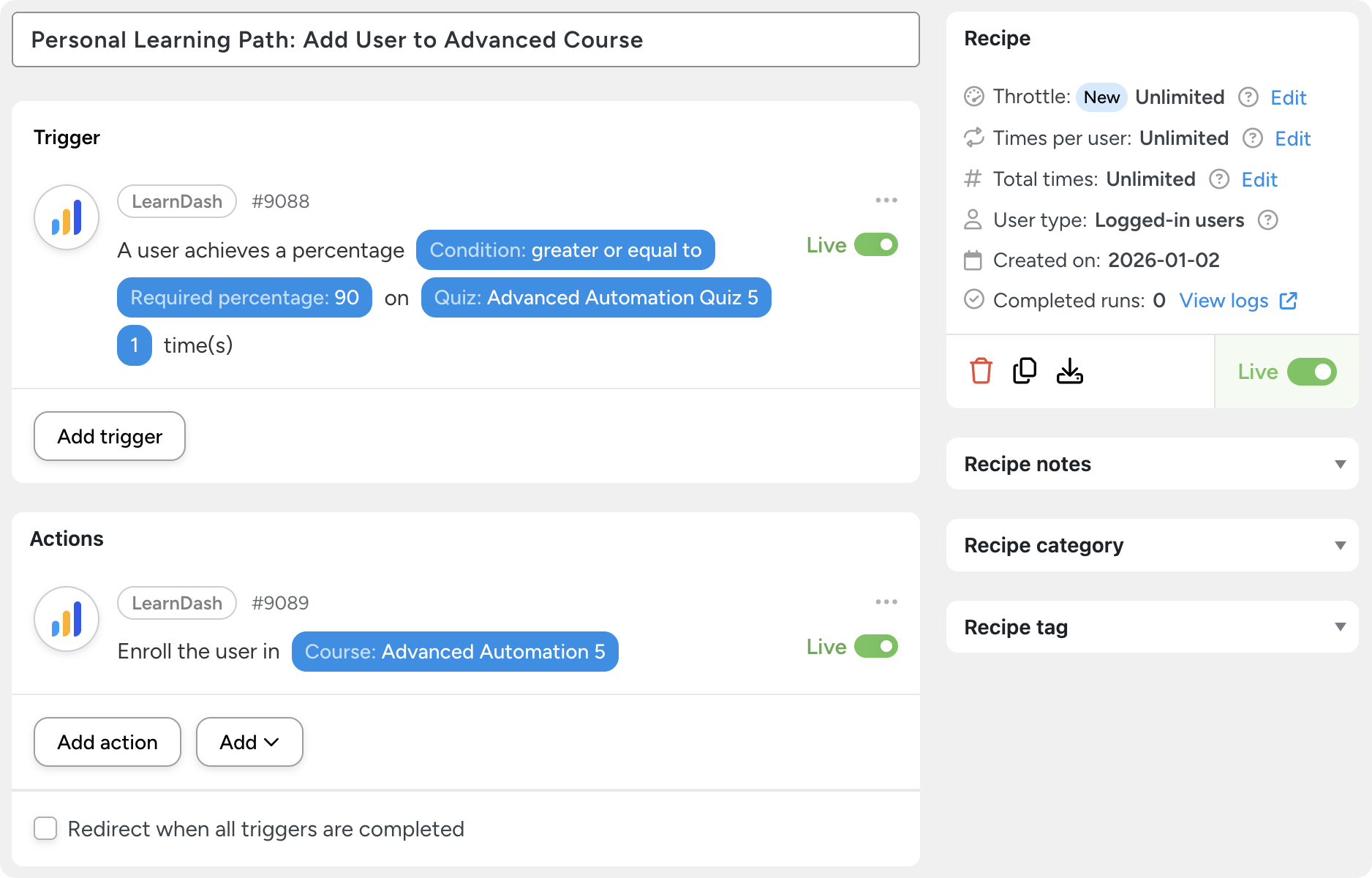 Give your recipe a name that makes it easy to recognize at a glance. For example, I have named this recipe, “Personal Learning Path: Add User to Advanced Course”.