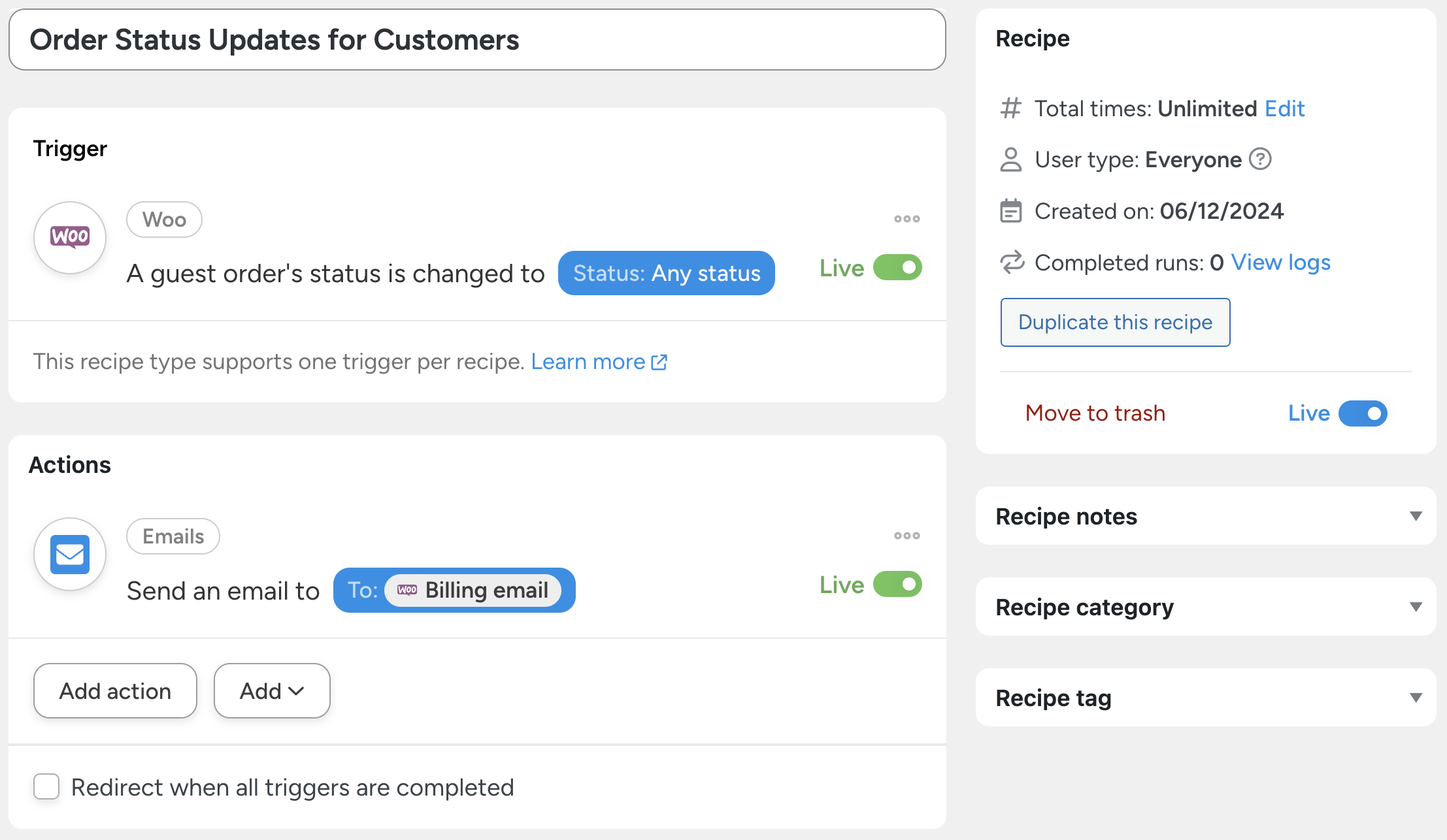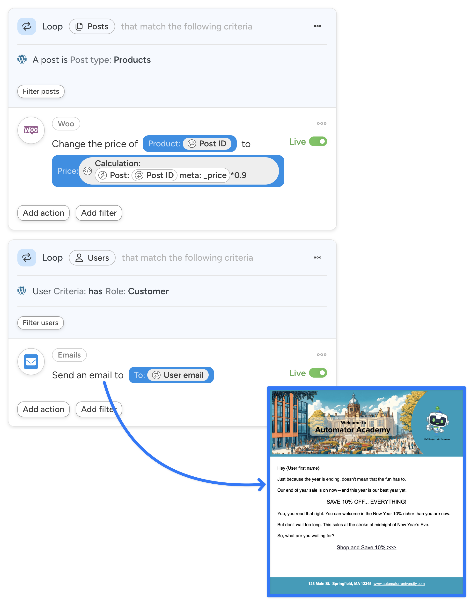 With the Automator recipe pictured above, however, we’re not only able to activate our storewide sale. We’re able to launch an entire email campaign directly from our WordPress website using nothing but Uncanny Automator Pro.