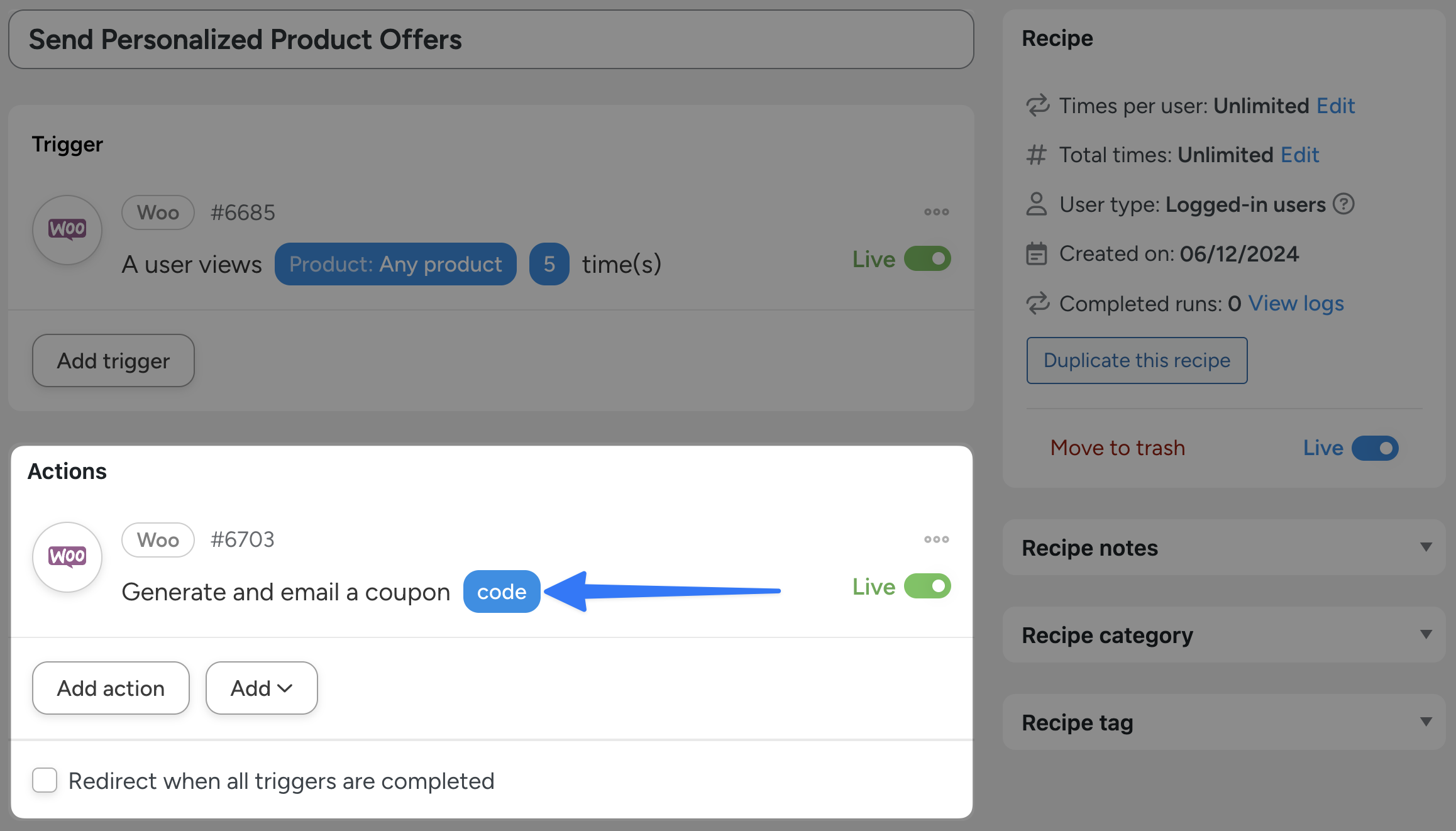 Because Automator is fully-integrated with your WordPress website, you can create personalized shopping experiences for your customers. For example, how about a recipe that tracks the number of times a customer views a product without purchasing it? Then tag that contact in your CRM so you can send them emails and offers that they actually want to act on.