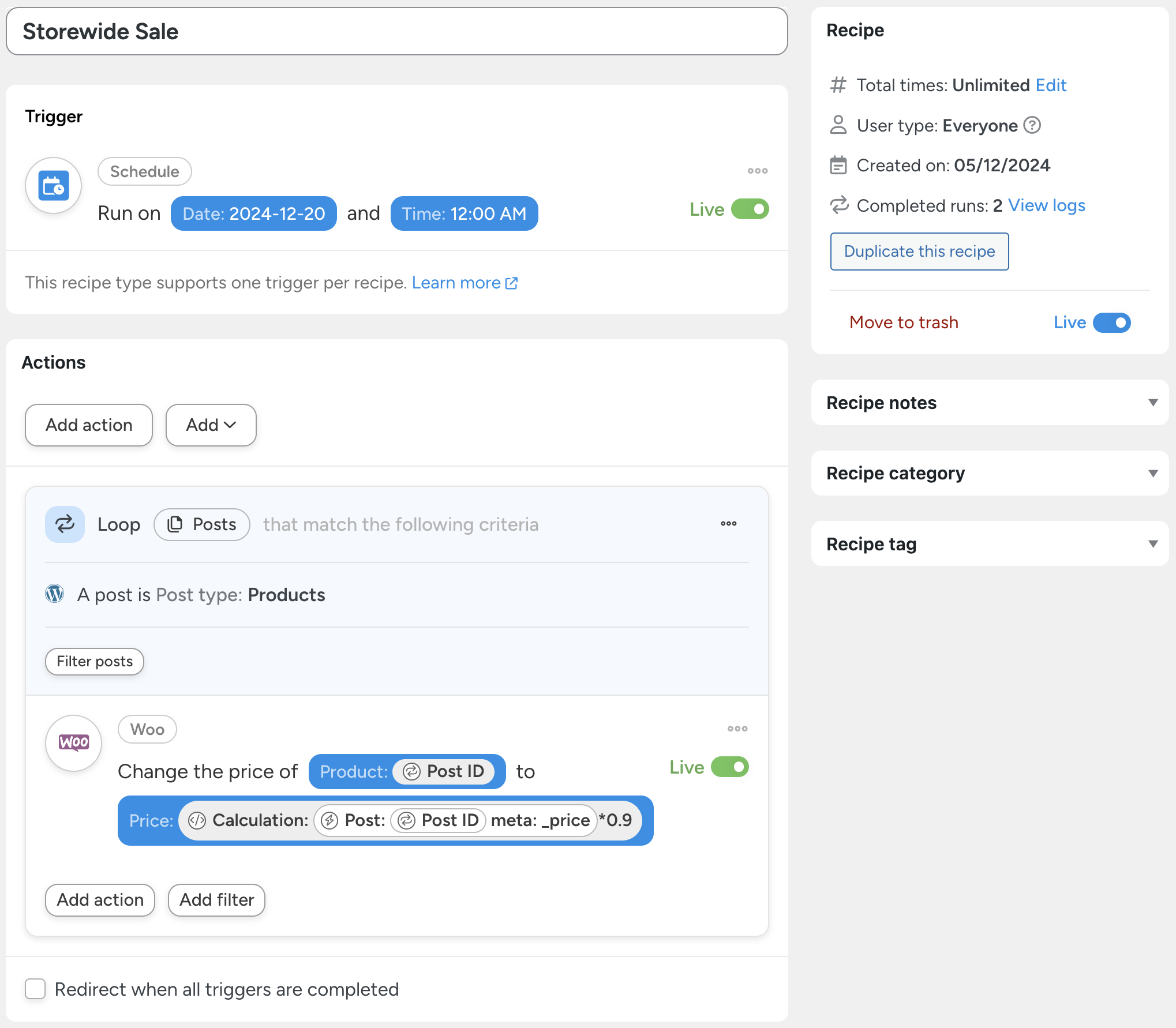 With the recipe pictured above, we’re able to schedule an automation that applies a storewide discount of 10%. Alternatively, we can choose any subset of products and apply a discount of our choosing.