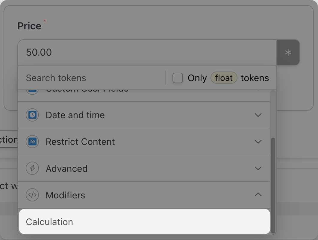 To use the Calculations feature, simply click the Asterisk in the Price field and select Modifiers > Calculation from the drop-down list.