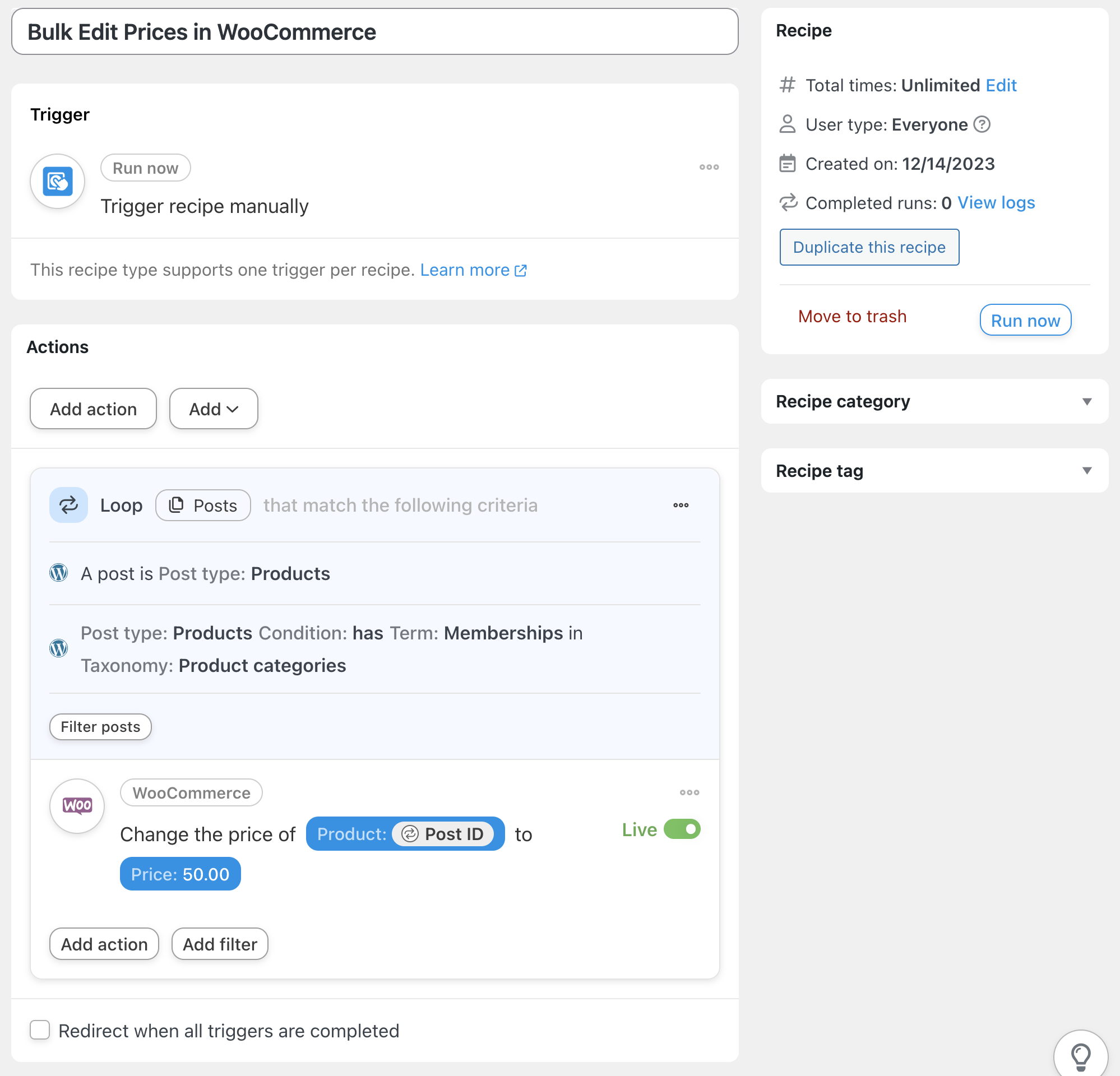 Give your recipe a name that makes it easy to recognize at a glance. For example, we’ve named this recipe “Bulk Edit Prices in WooCommerce”.