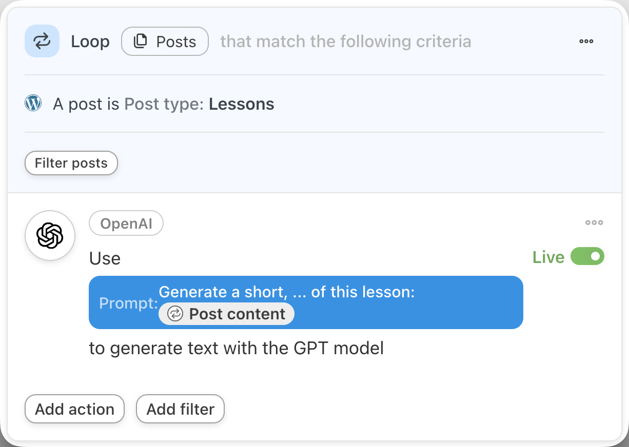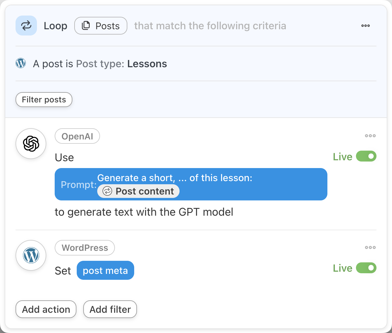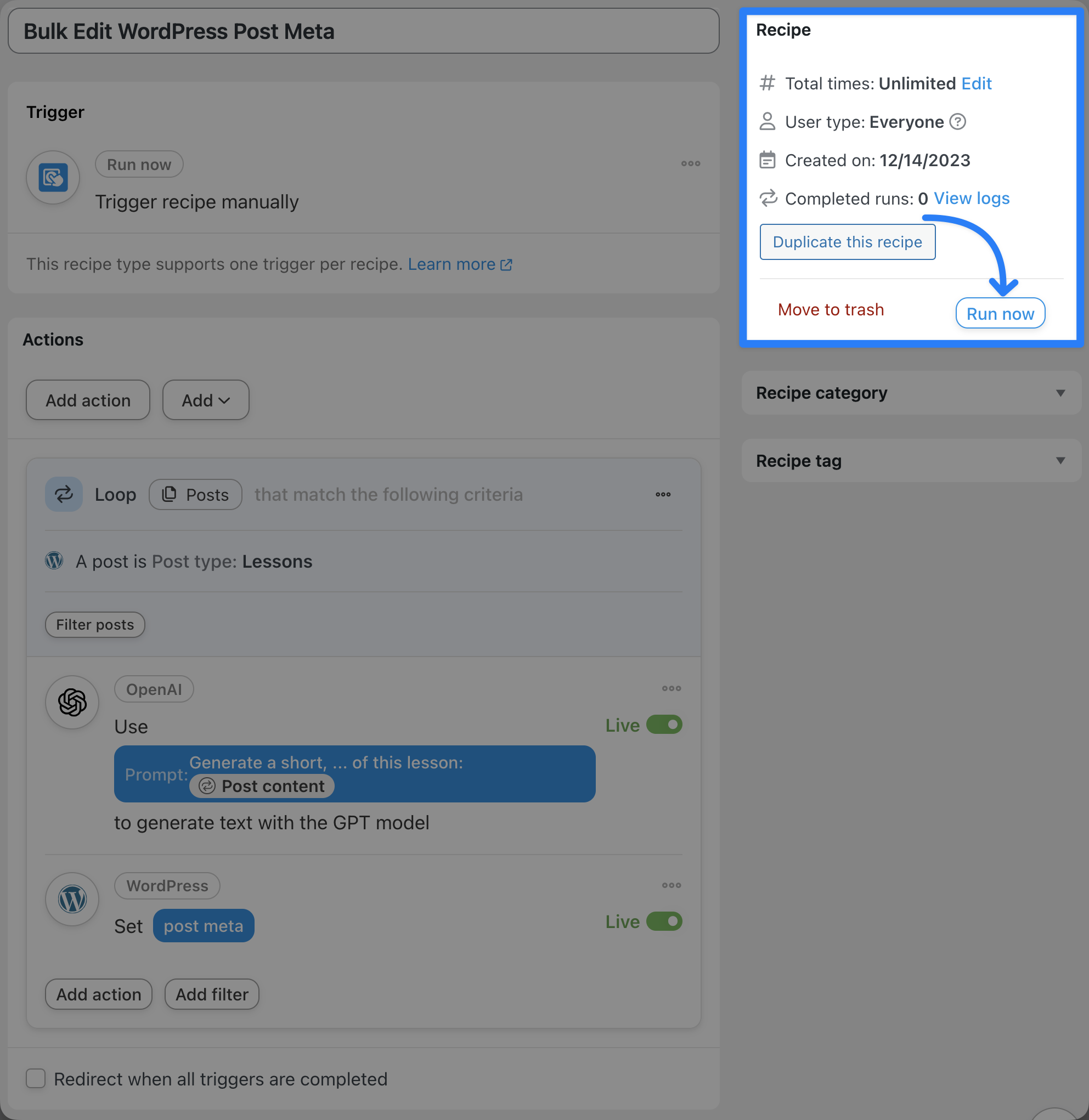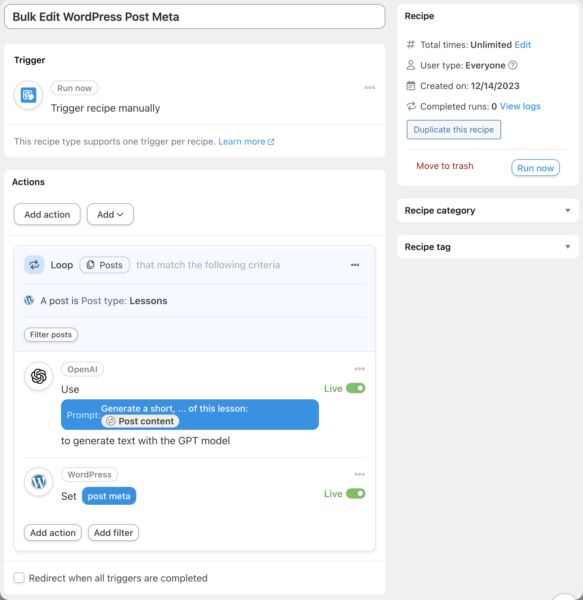 In the recipe pictured above, we’re able to add an AI-generated SEO summary to all of our existing LearnDash lessons. Then, using another action, we simply store those summaries as post meta with the key “ai_summary”.