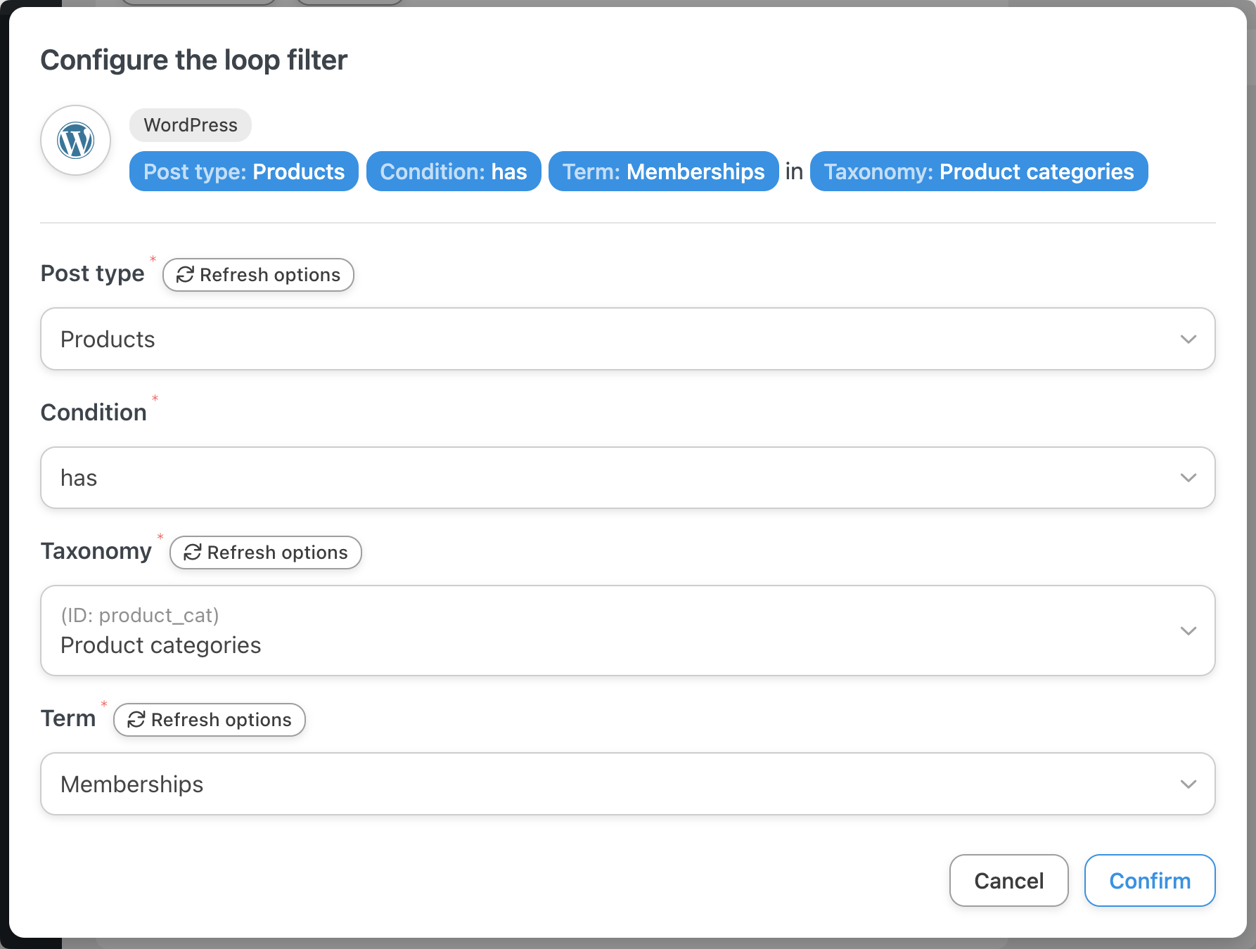 In the Loop panel, click Add action. From the menu of available integrations, select WordPress.