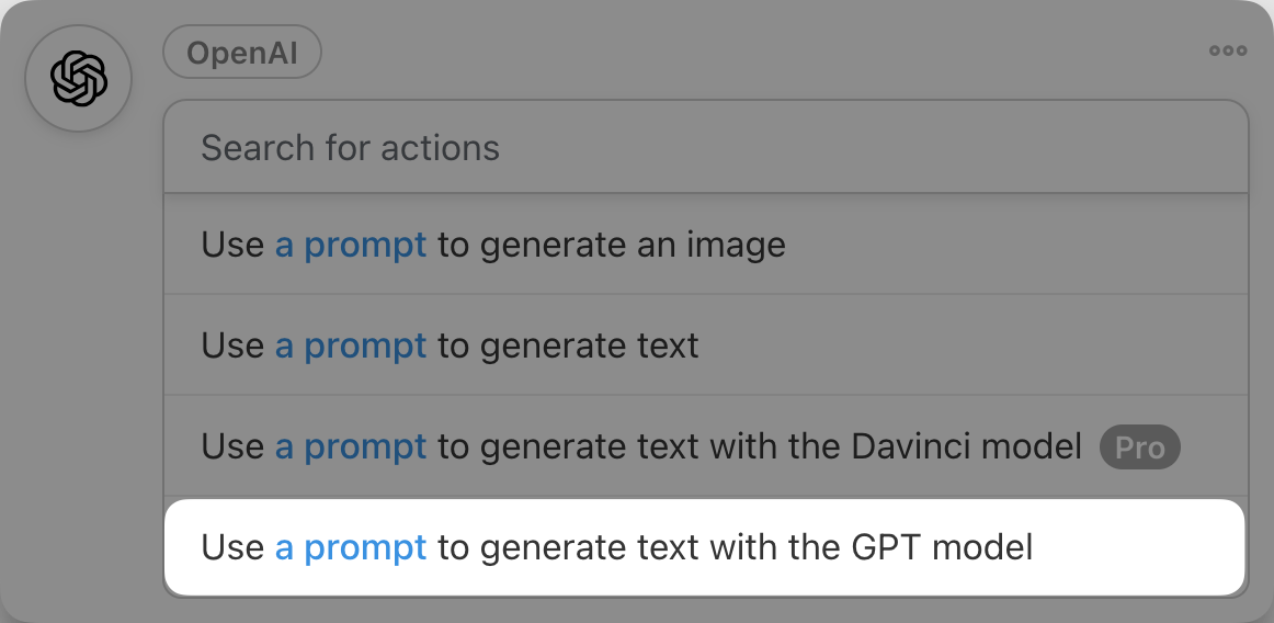 Once you’ve connected your account, from the drop-down list that appears, select Use a prompt to generate text with the GPT model.