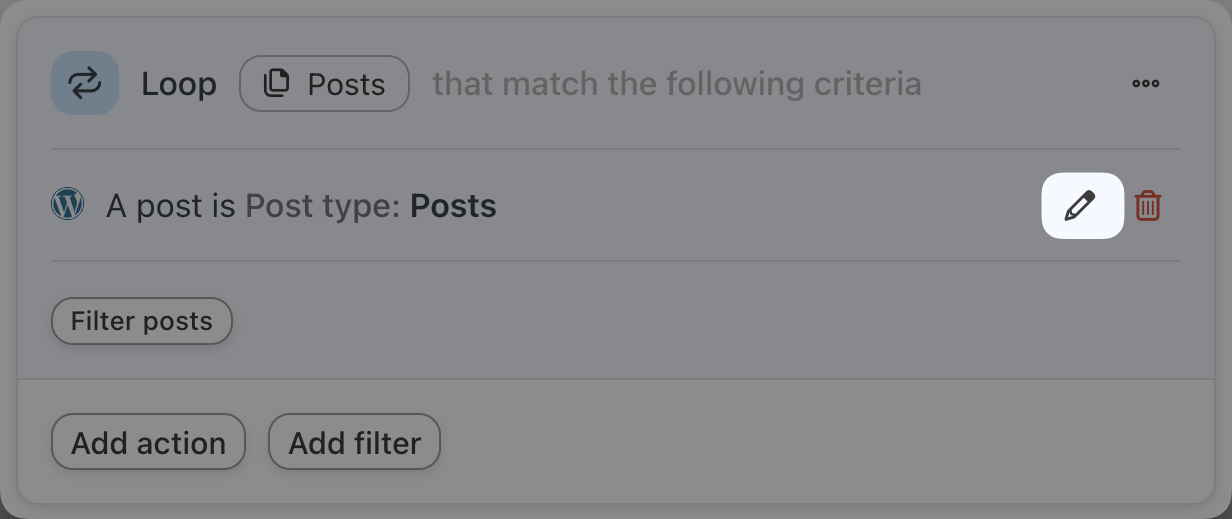 Automator will select the post type Post by default. As we are adding metadata to our lessons, we will want to change the post type. To do this, simply hover over the Loop panel and click the Edit filter icon.