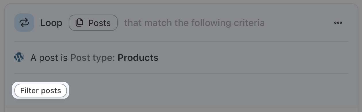 Click the Edit filter icon and select the post type Products. Next, because we don’t want to change the price of all of our products, we’re going to add a filter. To do this, click the Filter posts button.