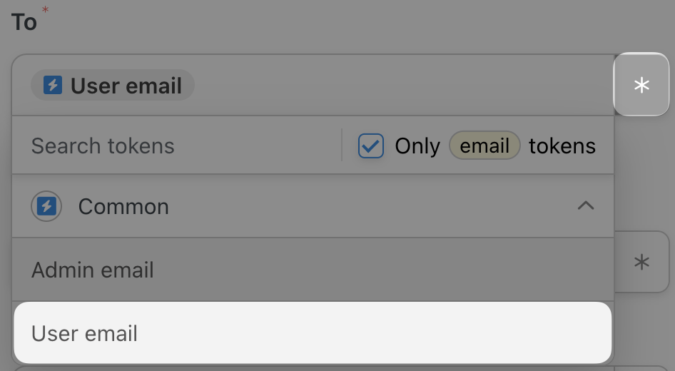 Automator will present you with an email form. You can fill out this form using tokens (dynamic data pulled from your WordPress website and from within recipes). To select a token, click the Asterisk.