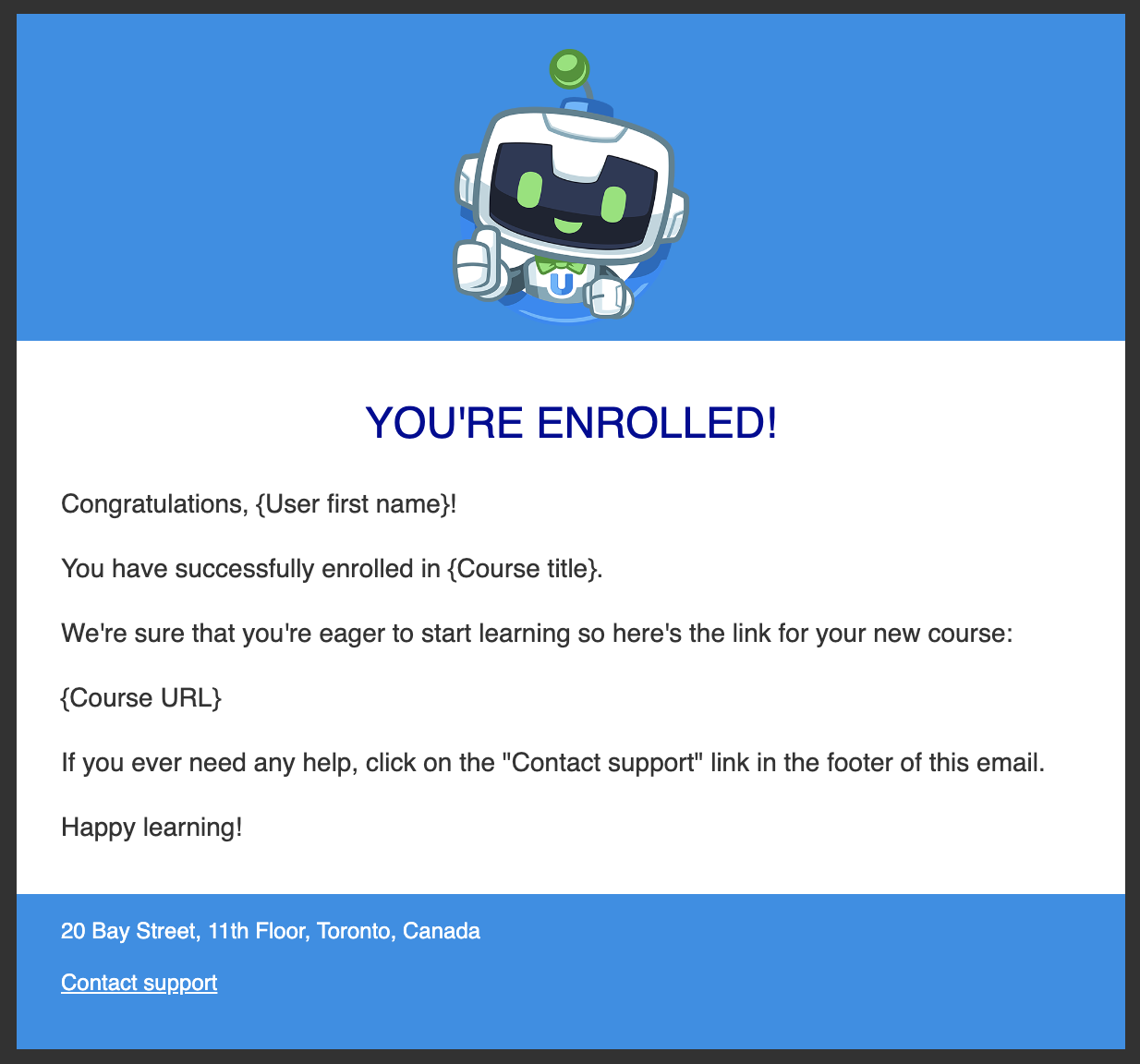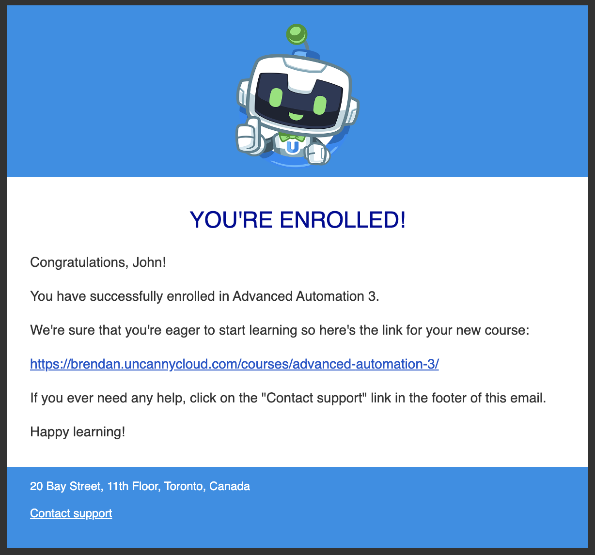 Now, whenever a user registers for one of our courses, they’ll get an email that looks just like the one we showed you at the very beginning.