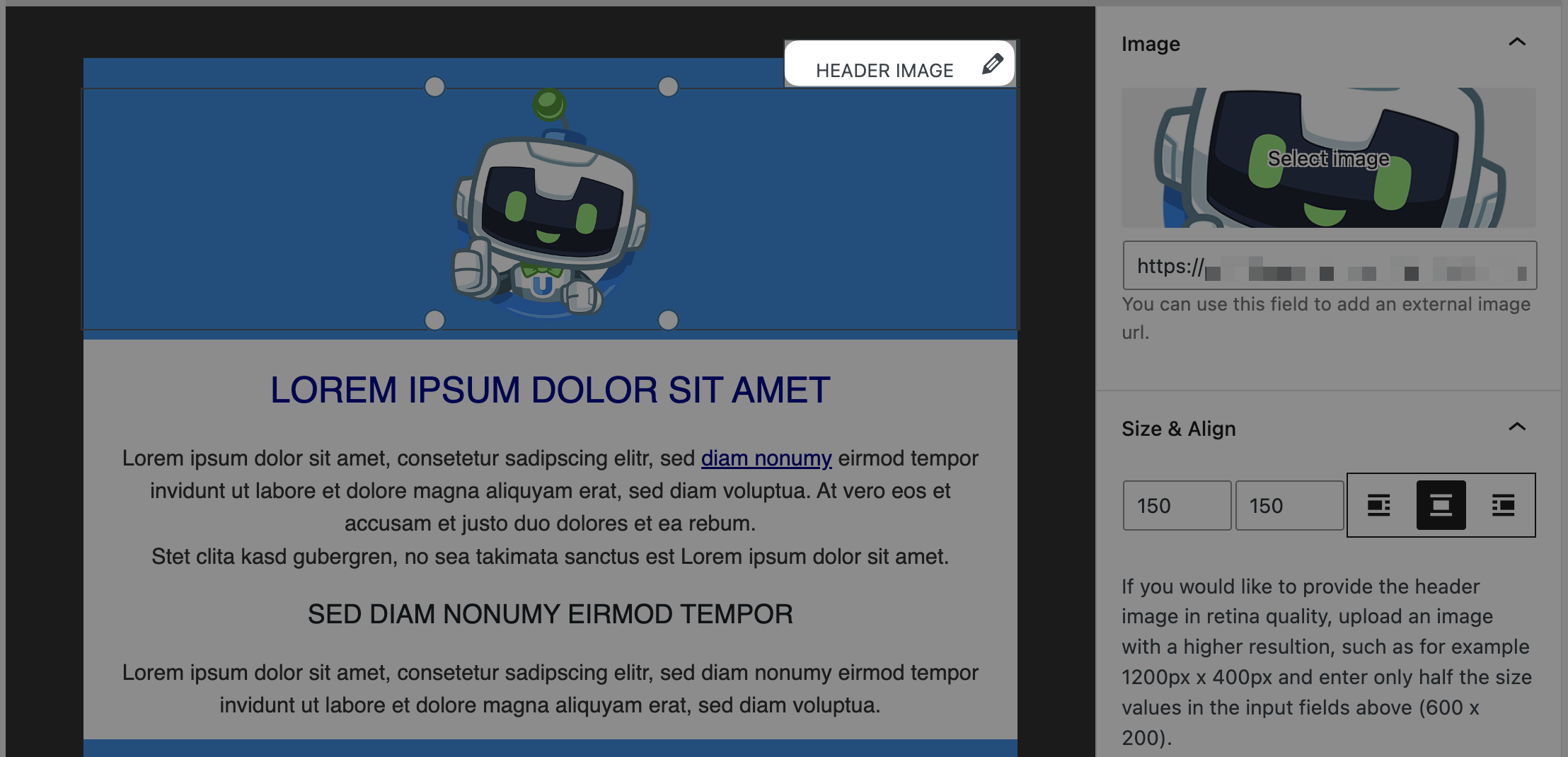 Next, you can edit the Email header. WP HTML Mail gives you several header options; we chose the option that only displays an image and set the background color to match our brand.